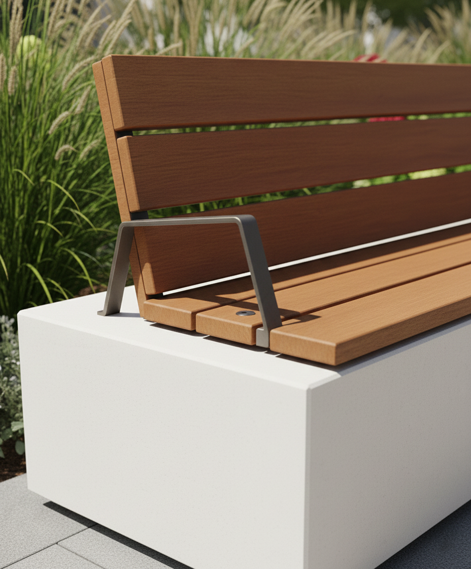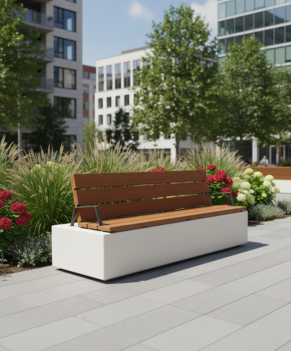 El Banc Longo és un banc urbà modular de disseny contemporani, format per una base de formigó arquitectònic i un seient de fusta natural, pensat per a espais públics d’ús intensiu. El seu disseny sobri i funcional permet crear conguracions lineals o combinades, adaptant-se a diferents entorns urbans.